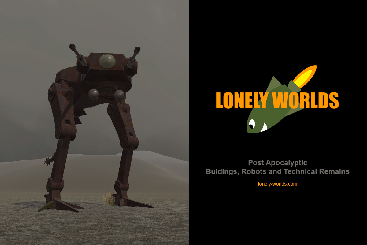 Lonely Worlds create buildings, (mech-like) robots, technical remains, game characters and statues. All in Post Apocalytic style.
